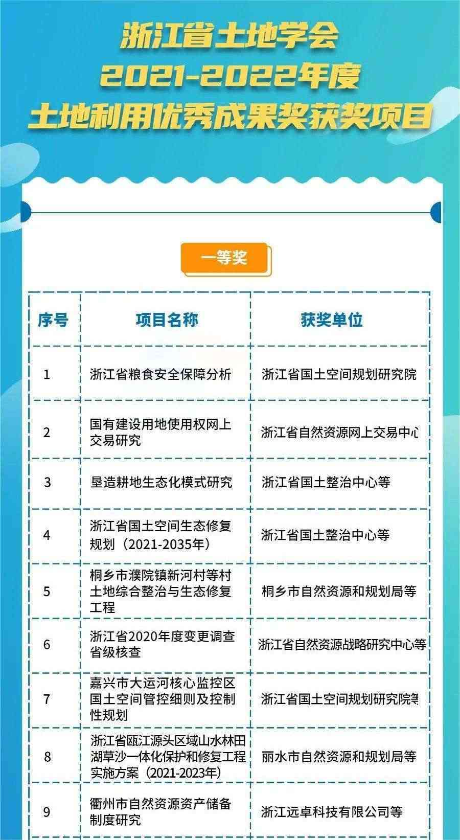 近期,由浙江省土地學會舉辦的2021-2022年度“省土地利用優秀成果獎”評選工作圓滿結束,我司有幸在評選工作中榮獲兩個一等獎。