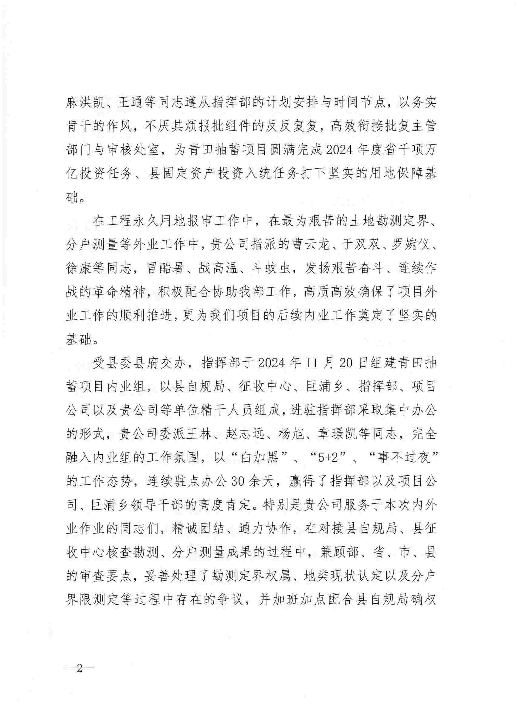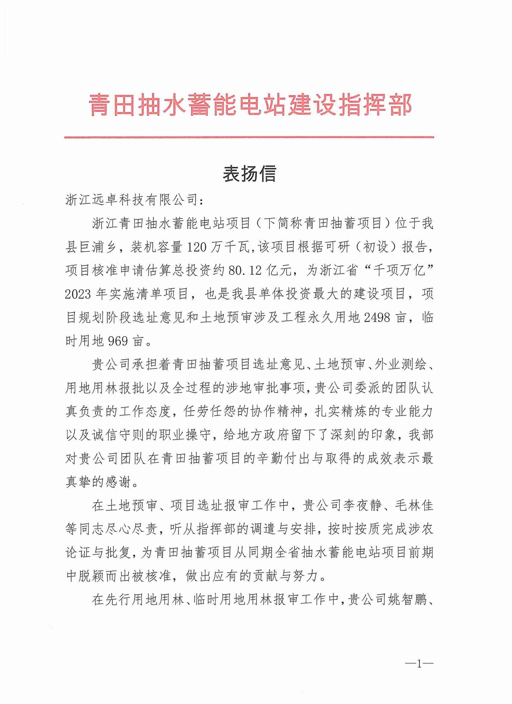 在辭舊迎春之際,公司收到了來自青田抽水蓄能電站建設指揮部的表揚信,信中對公司青田抽蓄項目組成員,在該項目報批過程中的辛勤付出與卓越成效,表示最真摯的感謝,同時也對公司擁有如此出色的團隊與優秀的企業文化深表祝賀。