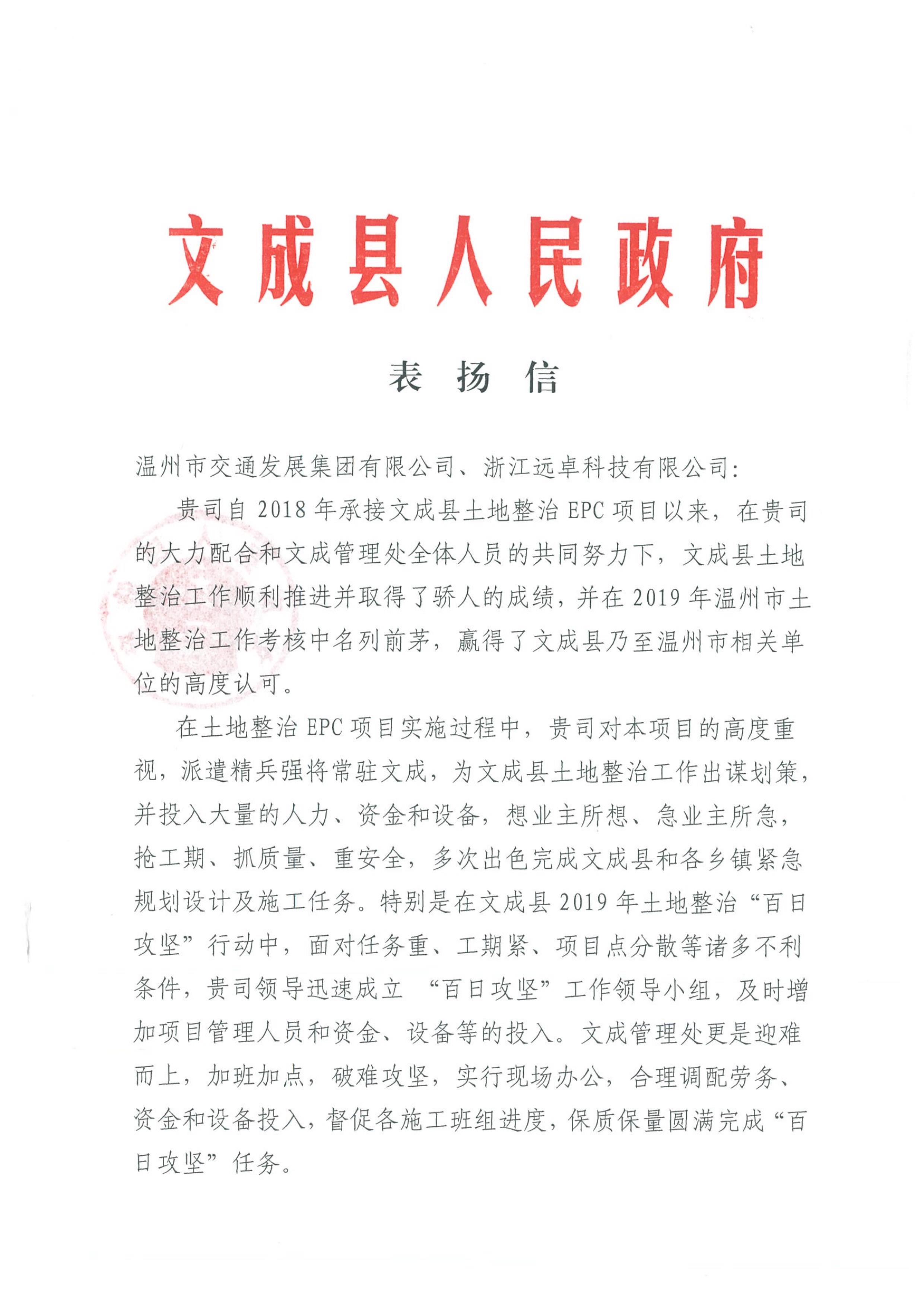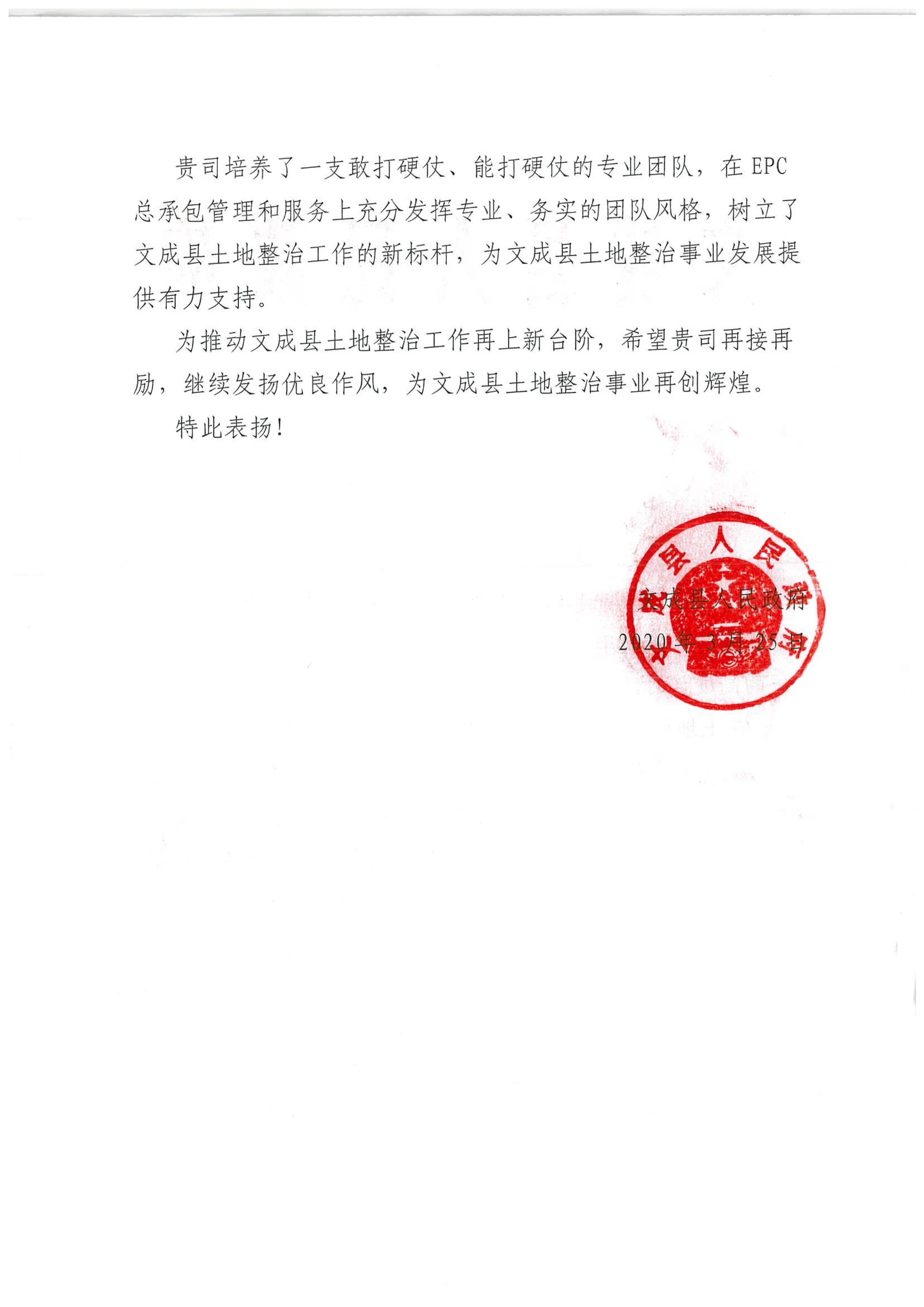 2020年3月25日,我司收到文成縣人民政府發(fā)來的關(guān)于《文成縣土地整治EPC項(xiàng)目》的表揚(yáng)信,表揚(yáng)文成EPC項(xiàng)目組在文成縣土地整治EPC項(xiàng)目中的杰出工作,贏得了文成縣乃至溫州市相關(guān)單位的高度認(rèn)可。