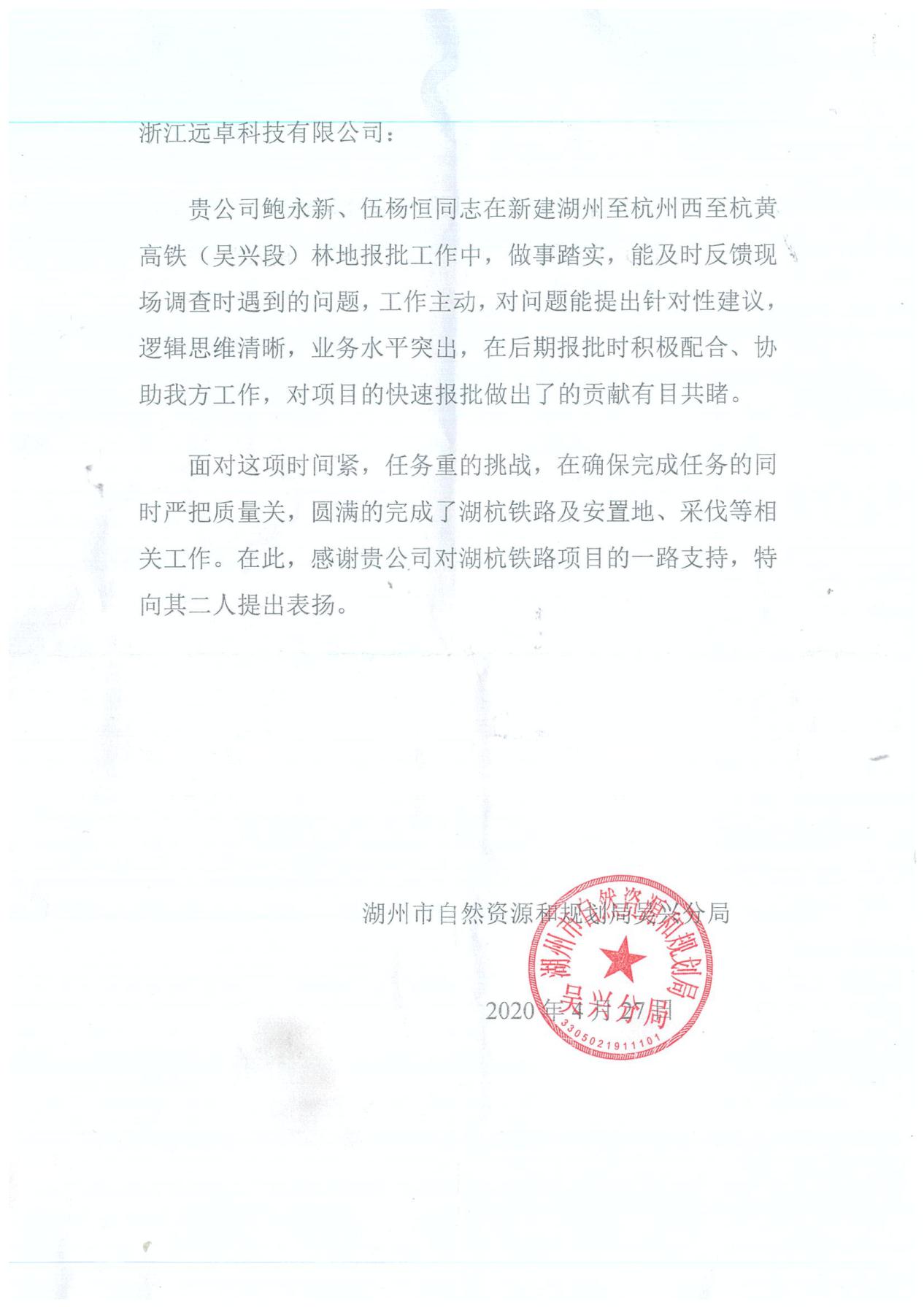 2020年4月27日,我公司收到業(yè)主發(fā)來的關(guān)于《湖州至杭州西至杭黃高鐵(吳興段)林地報批項(xiàng)目》項(xiàng)目組鮑永新、伍楊恒兩位同志的表揚(yáng)信,表揚(yáng)兩位同志能在緊張的工作時間中,確保任務(wù)完成的同時嚴(yán)把質(zhì)量關(guān),圓滿地完成了湖杭鐵路及安置地林地報批、林木采伐設(shè)計(jì)等相關(guān)工作。